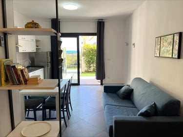 Il punto di forza esclusivo è l’area esterna privata: un giardino curato, attrezzato con tavolo e sedie, dove potrete godervi la brezza marina durante la colazione o rilassarvi dopo una giornata trascorsa al sole.